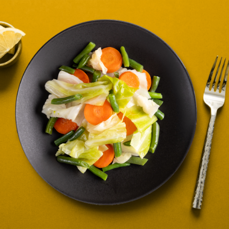 Boiled carrots, beans, and white cabbage tossed in butter and garlic, seasoned to perfection with vegetable seasoning, creating a delectable and aromatic side dish.