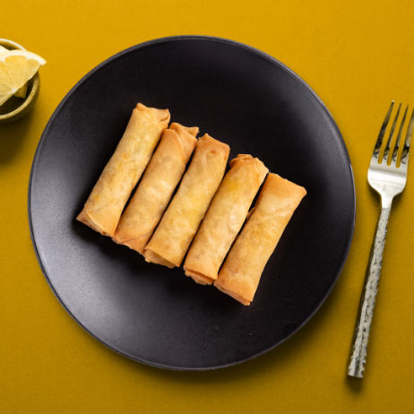 Crispy, golden rolls filled with fresh vegetables, served as a platter of 3 pieces, perfect for a light snack or appetizer