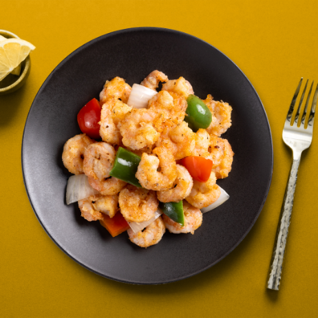 Tender shrimp seasoned with Cajun spices, stir-fried with onions and capsicum for a flavorful and juicy bite.